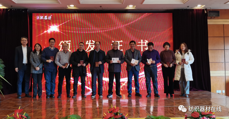 隨后,中國紡織機械協會總工李毅和全國紡織機械與附件標準化技術委員會主任委員李雪清向紡織器材分會委員頒發證書;中國紡織機械協會總工李毅和《紡織器材》雜志社社長、主編秋黎鳳向《紡織器材》期刊編委會委員頒發證書。