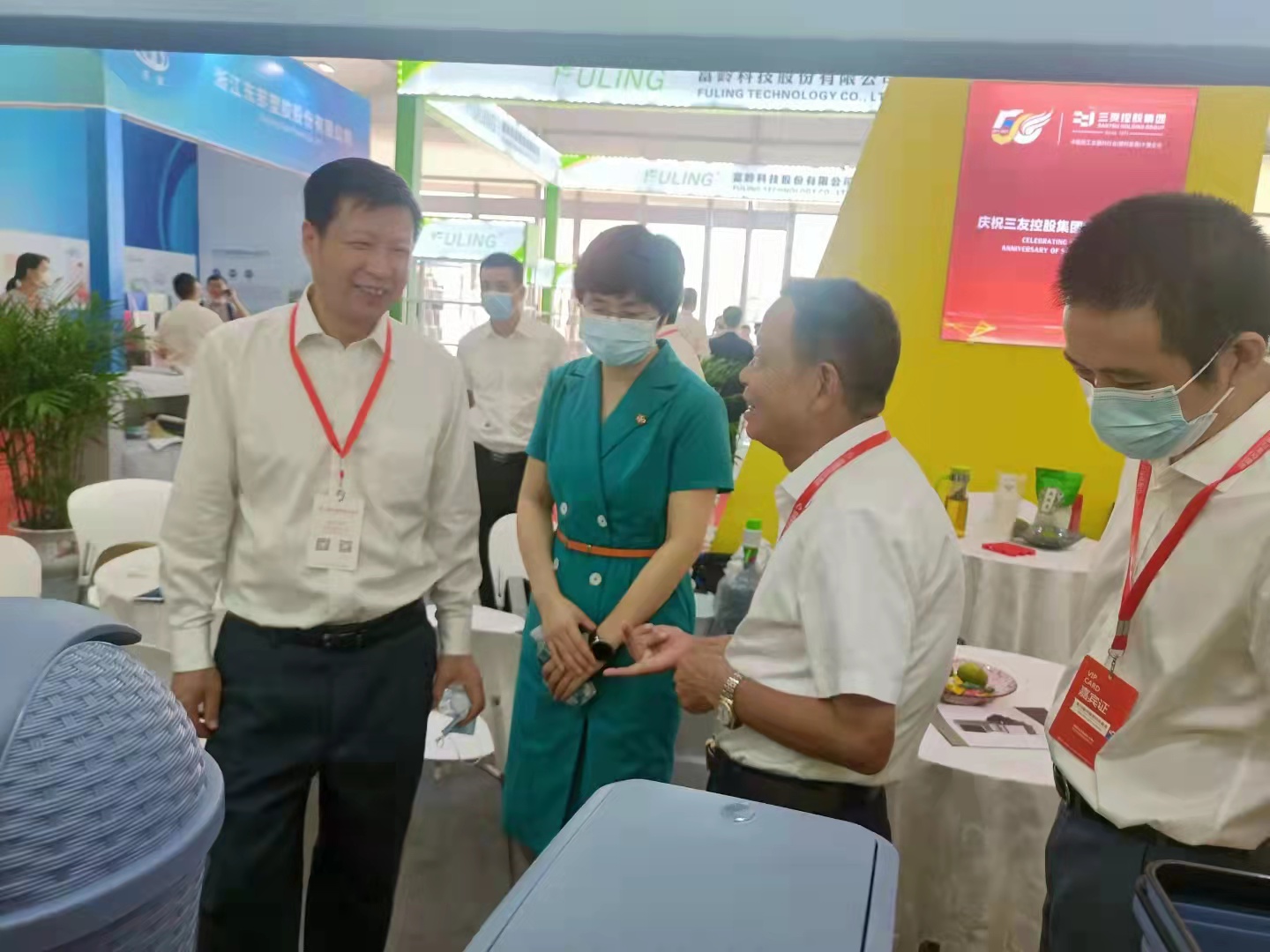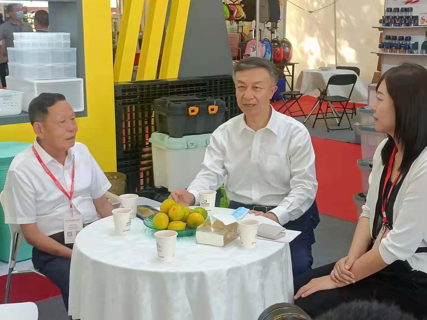 開幕式后,中國塑料加工工業協會理事長朱文瑋、市浙江省商務廳一級巡視員胡濰康等領導先后來到三友展區參觀,集團公司董事長張小赧、總經理張利敏為他們介紹企業產品及產業發展情況。