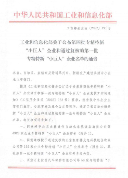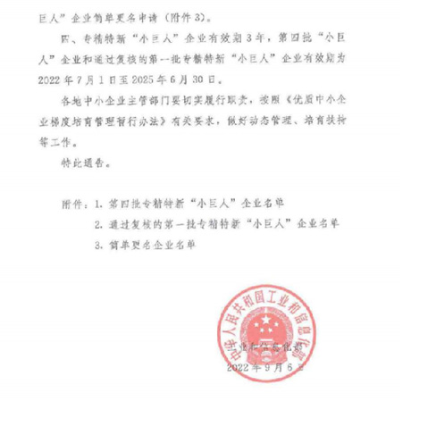 2022年10月,工業和信息化部辦公廳開展第四批專精特新“小巨人”企業培育,經省級中小企業主管部門推薦,專家審核及社會公示等程序,確認了第四批專精特新“小巨人”企業,浙江三友塑業股份有限公司通過評定。